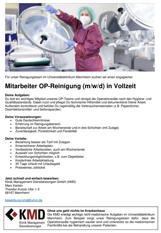Die Klinik Management Dienstleistungen GmbH (KMD) erledigt wichtige nicht-medizinische Aufgaben im Universitätsklinikum Mannheim. Zum Beispiel sorgt unser Reinigungsteam dafür, dass die Operationssäle hygienisch sauber sind und unterstützt so unsere medizinischen Fachkräfte bei der Behandlung unserer Patienten.